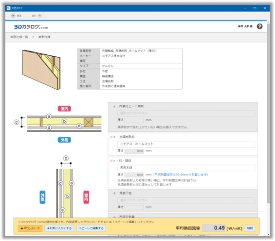 3Dカタログサイト(Web)上で提供される断熱仕様の「かんたん仕様画面」です。各部位・構造・工法に対する使用場所への材料や厚さを調整して、平均熱貫流率を設定します。使用場所を参考図を見ながら設定できるため、調整しやすい画面構成になっています。
