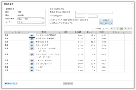 断熱仕様をお気に入りとして登録します。「断熱仕様一覧」の「★」欄に★マークが表示され、お気に入りのみを検索することができます。 |