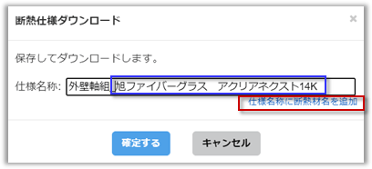 ZEROの「断熱仕様登録」一覧へ取り込みます。![]() 新規作成時は、材料名を語尾に追加する[仕様名称に断熱材名を追加]で「_{選択中の断熱材メーカー名 断熱材名}」 を末尾に追加します。(先頭1つ目のみ) ![]() |