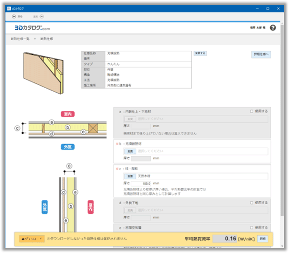 3Dカタログサイト(Web)上で提供される断熱仕様の「かんたん仕様画面」です。各部位・構造・工法に対する使用場所への材料や厚さを調整して、平均熱貫流率を設定します。使用場所を参考図を見ながら設定できるため、調整しやすい画面構成になっています。