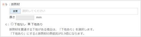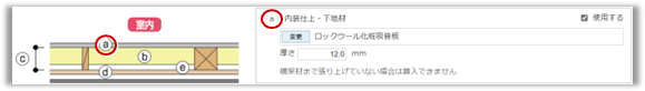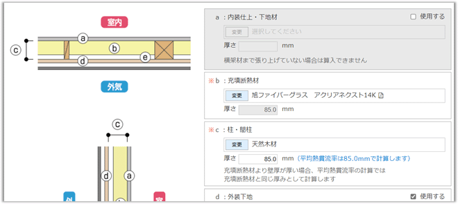 「使用場所」に対する「材料」「厚さ」を設定します。アルファベット記号(a~)に相応する平面・断面を参考にすることができます。