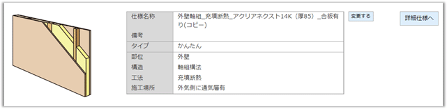 | 概要 | 追加・選択した断熱仕様の名称、タイプ、部位・工法等を表示します。 | |