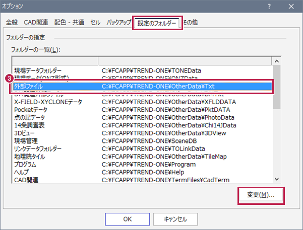- [既定のフォルダー]タブで「外部ファイル」を選択して[変更]をクリックします。