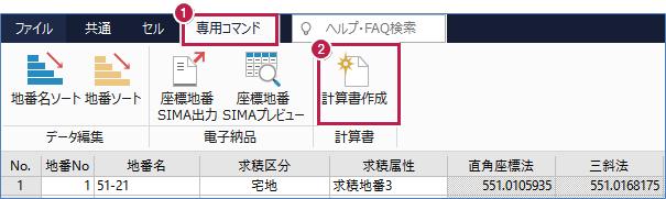 Q:《面積計算》の計算書を1地番ずつではなく、まとめて出力するにはどうしたらよいですか。