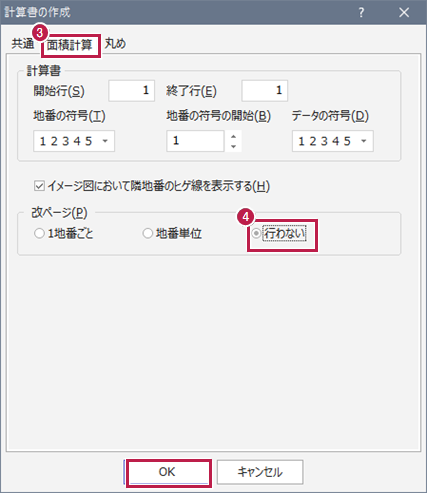 A:計算書作成時、[面積計算]タブの[改ページ]で設定できます。