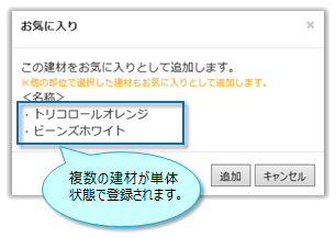 ここでのお気に入り登録は、[製品情報][他の部位]で選択した複数の建材が各々単体で登録されます。
