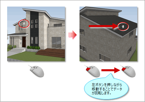 素材(屋根・サイディング等)以外の移動(回転)可能な部品(樹木等)を指定すると、対象データが赤くなり、移動/回転用のアイコンが表示されます(移動/回転できない部品を指定したときは赤く表示されません)。