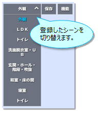 画面右上の[シーンリスト]より、建物の外観・内観(部屋名等)を選択し、[機能]より目的の操作を選び、建物外観・内観イメージをシミュレーションします。