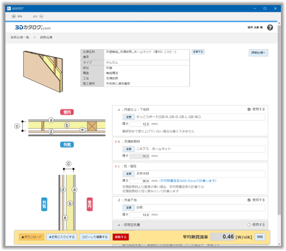 3Dカタログサイト(Web)上で提供される断熱仕様の「かんたん仕様画面」です。各部位・構造・工法に対する使用場所への材料や厚さを調整して、平均熱貫流率を設定します。使用場所を参考図を見ながら設定できるため、調整しやすい画面構成になっています。