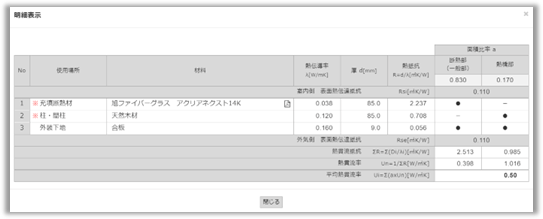 | 概要 | 追加・選択した断熱仕様の名称、タイプ、部位・工法等を表示します。 | |