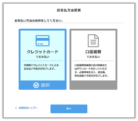 - お支払い方法変更画面より、[クレジット]または[口座振替]を選択します。