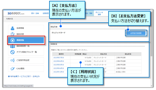 現在の支払い方法や月毎の利用状況の確認、明細書の出力(pdf)、また、支払い方法を変更することができます。