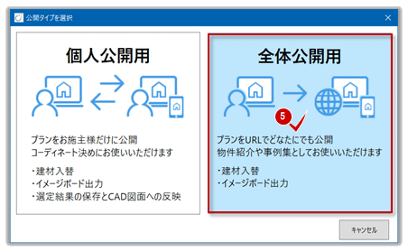 ※複数のシーン選択等、サイズが100MBを超えた場合はアップロードすることはできません。物件データの部品を削除したり、出力するシーンを減らす等して100MB未満に調整します。