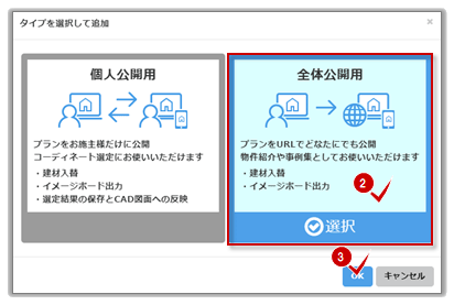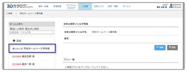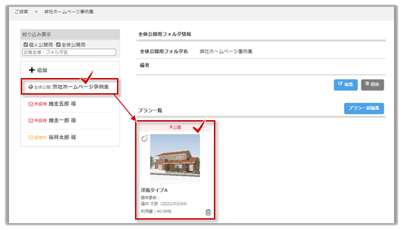 登録されたフォルダ名をクリックすると、アップロードした物件(プラン)アイコンが、全体公開用のプラン一覧に表示されます。