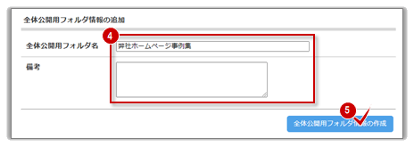 - 公開用事例のプランを登録して編集・確認するページのフォルダ情報名・備考を入力して、[全体公開用フォルダ情報の作成]を実行します。
