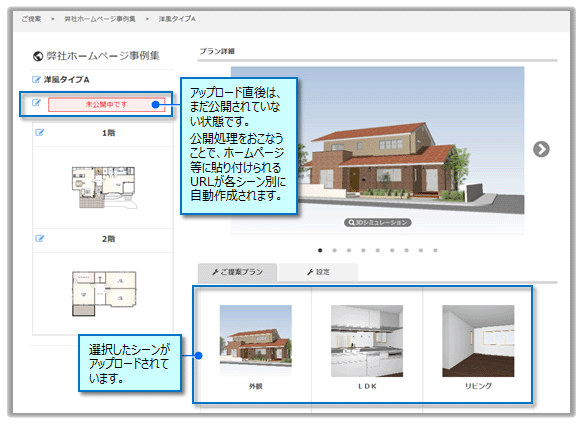 - プランアイコンをクリックすると、間取りや外観・部屋別のシーン(3Dシミュレーション)が登録されています。