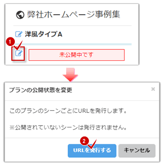 - 「未公開中です」の前のアイコンをクリックして、[URLを発行する]を実行します。