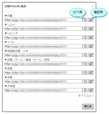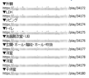 - アップロードしたシーン(外観・部屋ビュー)のURL(Webリンクパス)が一覧表示されます。