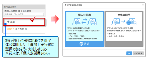 ご提案プラン追加時に、個人向け(施主やりとり用)と公開向け(HP記載等用)を選択可能にしました。 3DCサイトでのご提案プラン追加時、CAD(ZERO、RED、 Modelio)からのアップロード時に選択画面が表示されます。 ![]() |
