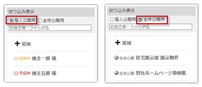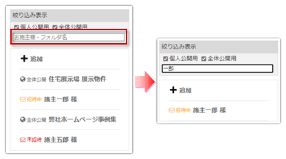登録したお施主様名や全体公開向け名称を検索することができます。![]() また、チェックマークだけでもタイプ別に表示します。 ![]() |