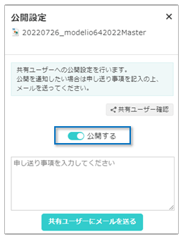編集中のデータが他者に参照・利用されないように、公開・非公開を切り替える[公開設定]を追加しました。 アップロードした「ZEROマスタ」、「Modelioマスタ」、「まるごと環境移行」のファイルに公開設定可能です。 ![]() さらに、公開したことを共有者にメールで送信することができます。 |