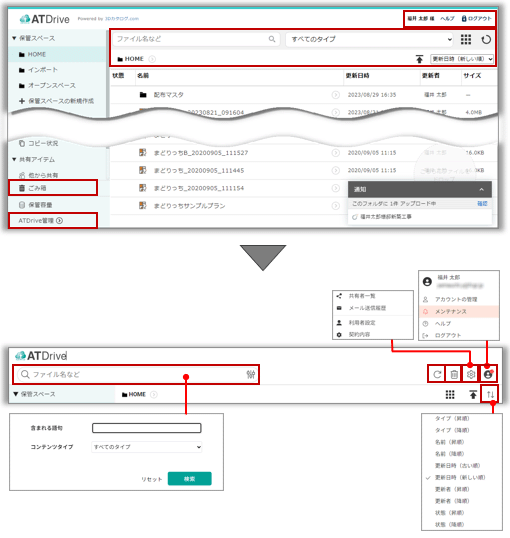 | ATDrive | フォルダ管理 | 画面上部(ヘッダー)・色等のデザインを変更しました。![]() ※表示幅が狭い場合(スマートフォン、タブレット等)の[検索機能][左枠(保管スペース等)]のアイコン化に対応しました。 ※CAD連携時、「ZERO」「Modelio」等の物件・プラン一覧へも一部機能します。 (→参照) |