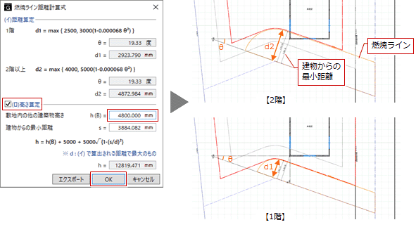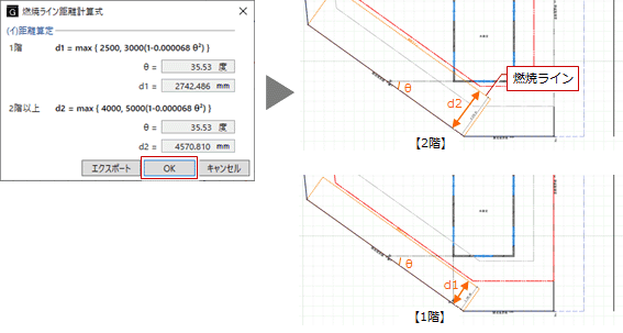 | (イ)距離算定 | 入力済の最小の角度寸法(θ)を使用して燃焼ライン距離を算定します。 以下の計算式で算出される隣地境界線等からの水平距離を超える部分が緩和されます。 1階:d1=max{2500,3000(1-0.000068θ²)} 2階以上:d2=max{4000,5000(1-0.000068θ²)} |
