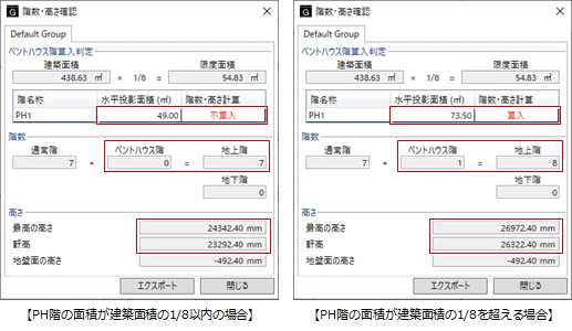 ペントハウス階の水平投影面積と建築面積の1/8の値を比較し、階数や高さに算入するか判定します。