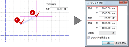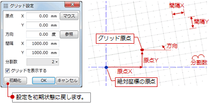 グリッドの原点、方向、間隔、分割数などを設定するには、