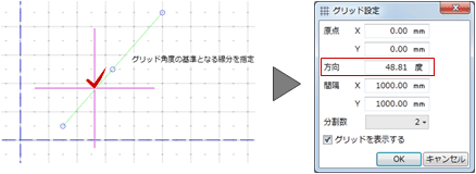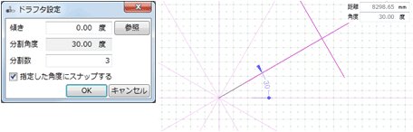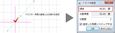 ドラフタ設定グリッドの原点、角度、間隔や、ドラフタの角度、分割数を設定します。