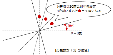 「分割数」が「1」のとき、カーソルの動きは90度単位になります。その動きの単位を小さくするときは、90度に対する分割数で設定します。