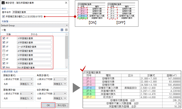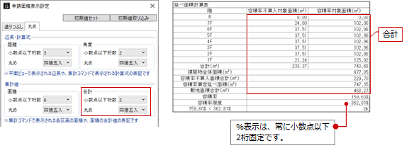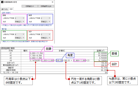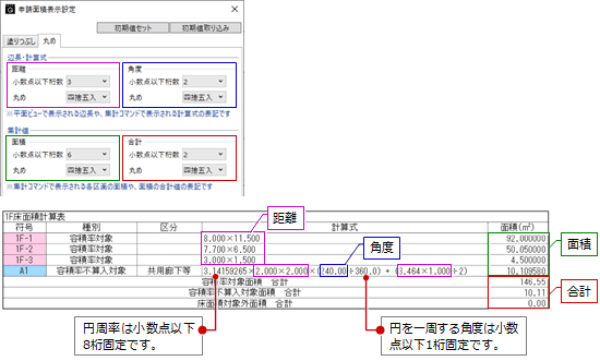 「申請面積表示設定」の「丸め」タブと相互連動します。