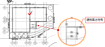 建物高さ符号が作図された確認申請配置図、または全体投影配置図、ボリューム解析配置図を指定して、建物高さ表を作成します。