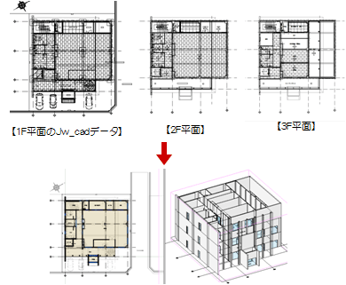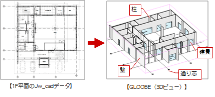 Jw_cad、DWG/DXF、SXFのファイルを読み込んで、2D汎用データをBIM化します。2D汎用の柱、壁レイヤなどの線分を参照して、柱、壁などのオブジェクトを自動配置できます。
