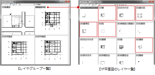 平面図ならば、1つのレイヤグループにその階の通り芯、基準芯、スペース、柱、壁、建具のデータが登録されている必要があります。配置図の場合は、敷地のデータが登録されている必要があります。