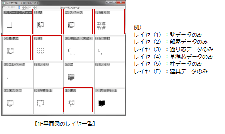 通り芯、基準芯、スペース、柱、壁、建具のデータが、その他のレイヤと分けられている必要があります。 ※ただし、柱データはレイヤ(5)とレイヤ(6)に入力というように、それぞれ複数のレイヤに分けられていてもかまいません。