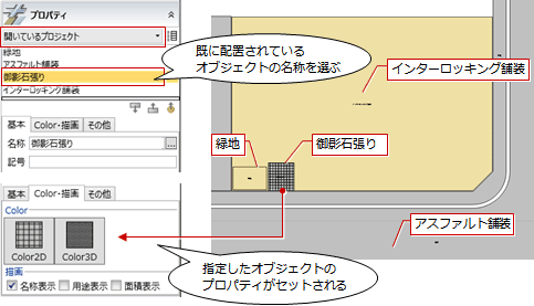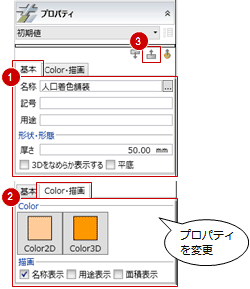 「舗装・緑地」を選びます。 - プロパティで名称、厚さ、Color2D/Color3Dなどを変更します。