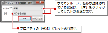 - テンプレートを更新するには、「テンプレート新規登録・更新」ダイアログの「グループ」「名称」で、すでに登録されているテンプレートと同じものを選ぶと更新になります。