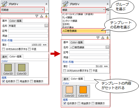 オブジェクトの名称や形状、色などのプロパティの内容は、セットでテンプレートに登録できるため、入力時にテンプレートを選ぶことにより、プロパティの内容を一括で読み込むことができます。