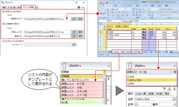 「プロジェクト」の「リスト・仕様書」タブで「断面リストを利用する」「仕様書を利用する」が設定されている場合、指定したファイルに登録されている内容がテンプレートとして表示され、プロパティをセットできます。