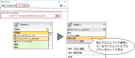 「プロジェクト」の「リスト・仕様書」タブで「他プロジェクトを利用する」が設定されている場合、指定したGLOOBEデータで配置されているオブジェクトからプロパティを取得できます。