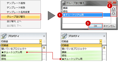 | グループ並び替え | リストに表示されるテンプレートのグループの表示順を並び替えます。![]() |