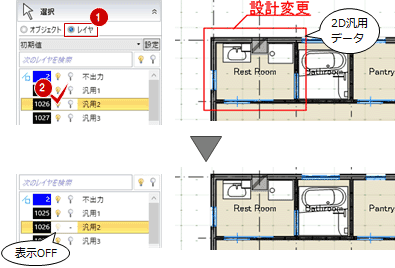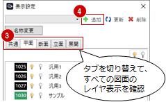 - 平面・断面・立面・展開のレイヤ表示を1セットで管理します。