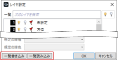 なお、新規プロジェクトを作成したときは、書き込まれた初期値が取り込まれた状態になります。 - 「図面作成」ダイアログの「レイヤ・ペン」にある「レイヤ管理」の場合は、「一覧書き込み」でレイヤ設定の内容をCSVファイルに出力できます。Excel等で編集したり、「一覧読み込み」で他のテンプレートに読み込むことができます。