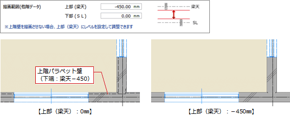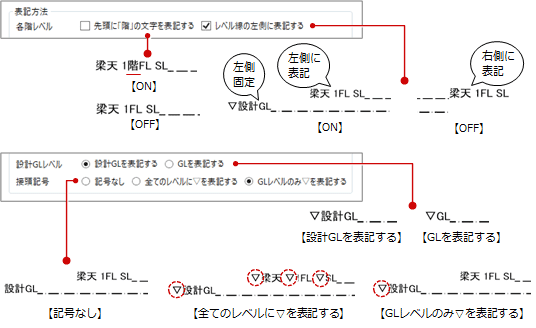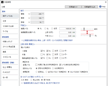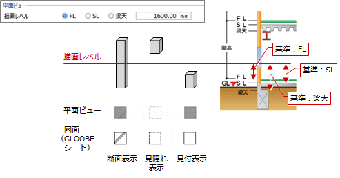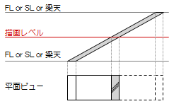 部材の描画する高さを、FL基準、SL基準、梁天基準のいずれかで設定します。部材が描画レベル上に存在するか、描画レベルより上・下に存在するかで、平面ビューの表示が変わります。