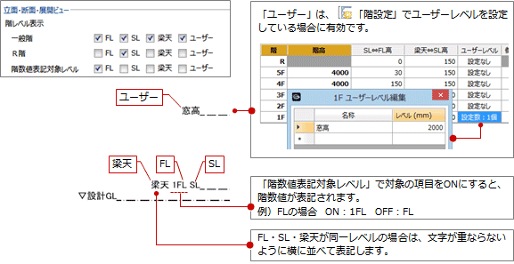 一般階とR階について、立面・断面・展開ビューでレベル表示する項目にチェックを付けます。