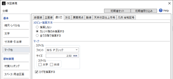 断面線、立面線、通りマーク、方位、展開視点、動線、天井伏図仕上符号、凡例の省略記号の表現について設定します。