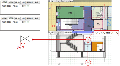 断面線・立面線のクランクのマークを変更するにはM037150_mrk_sec01
