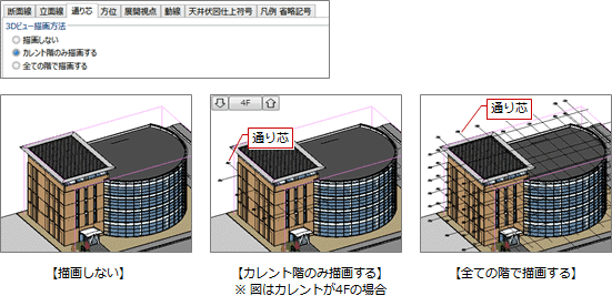 3Dビューでの通り芯の描画方法や、通りマークの文字のフォント、サイズなどを設定します。
