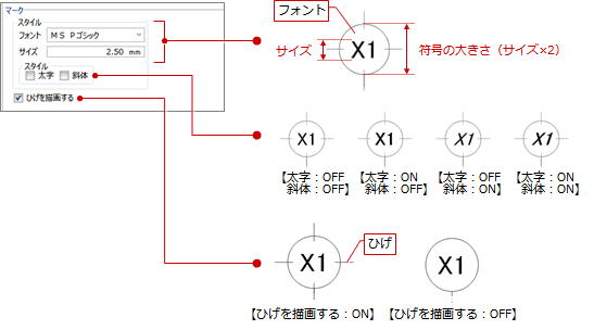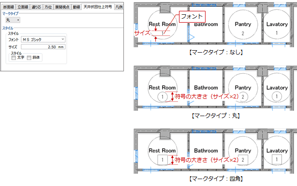 「天井伏図仕上符号」で加筆する符号の形状やフォント、サイズなどを設定します。
